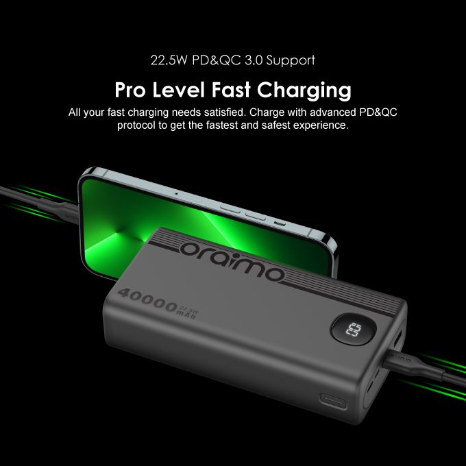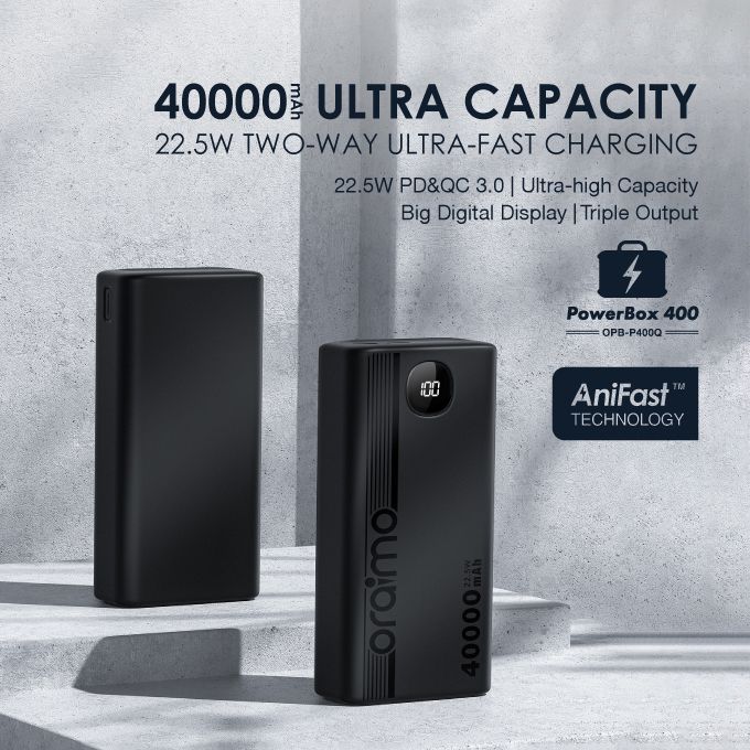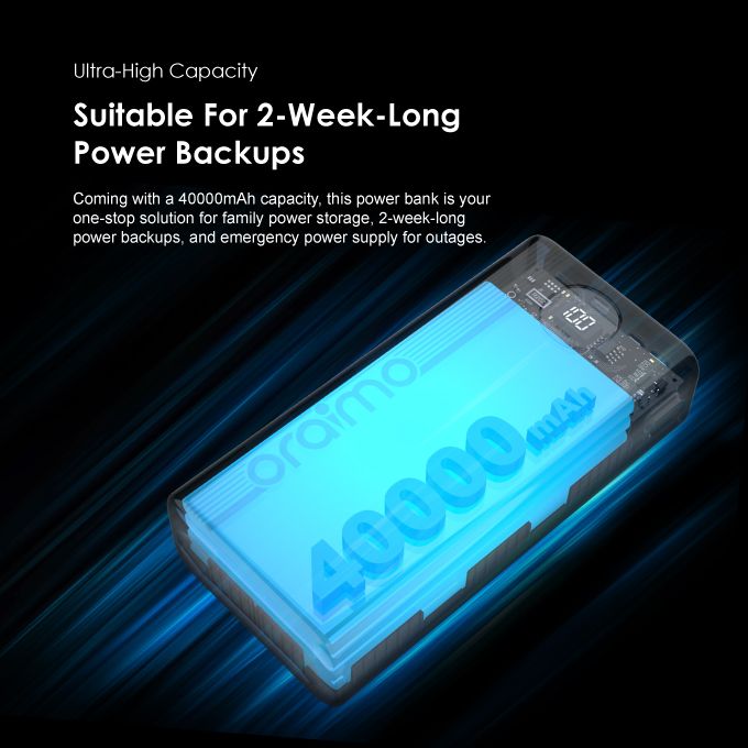 Introducing the Oraimo PowerBox 40000mAh Power Bank – your ultimate companion for staying powered up on the go.